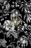 Prachtig zwart behang met daarop vintage afbeeldingen van planten.