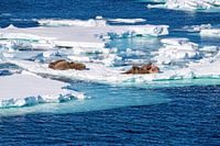 Wanneer je met een schip rondom Spitsbergen vaart, kom je regelmatig ijsplaten tegen drijvend in de zee. Wanneer je geluk hebt kom je ook nog wilde dieren tegen op deze ijsplaten zoals deze Walrussen.
