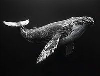 In deze afbeelding zweeft een walvis door de duistere oceaan, zijn massieve lichaam omringd door een achtergrond van diep, ondoordringbaar zwart. Het contrast tussen het licht dat zijn huid zachtjes raakt en de inktzwarte leegte eromheen benadrukt zijn indrukwekkende omvang en stille aanwezigheid. Elke rimpeling op zijn huid, elke…