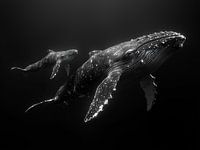 In deze zwart-wit afbeelding glijden een walvis en haar jong sierlijk door de donkere oceaan. Hun lichamen contrasteren krachtig tegen de diepzwarte achtergrond, waardoor elk detail — van de zachte ronding van het kalf tot de imposante vormen van de moeder — helder naar voren komt. Het kalf blijft dicht bij haar zijde, als een schaduw…