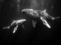 In een mooie zwart-wit foto zwemmen een walvis en haar jong door de stille oceaan. Zacht, gefilterd licht breekt door het wateroppervlak en glijdt neer op hun lichamen, waardoor hun contouren subtiel oplichten te midden van de duisternis. Het kalf blijft dicht tegen de moeder aan, beschermd en gedragen door haar aanwezigheid. Hun…