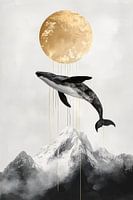 Een majestueuze walvis slingert tussen de steile bergtoppen en de gloeiende gouden maansikkel en belooft zachte dromen in de nacht. De harmonieuze kleurtonen en dromerige sfeer maken dit kunstwerk de perfecte toevoeging aan een slaapkamer die uitnodigt om te ontspannen en te dromen.