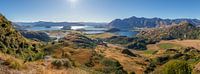 Een panoramisch uitzicht over het meer van Wanaka en Bishops Bay vanaf de Rocky peak berg.