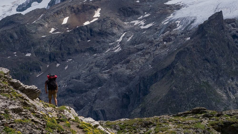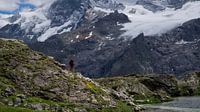 Een bergwandelaar loopt met zijn rugzak langs een meertje (Lac Lérie) met uitzicht op de gletsjers van het Nationaal Park des Écrins in Frankrijk. Dit zijn de gletsjers rond de top van La Meije (3984 meter). De plek is lopend bereikbaar vanuit La Grave. De uitzichten zijn indrukwekkend met de vele details van de rotsen, het ijs en de sneeuw. De gele bloemen op de voorgrond vormen daarmee een bijzonder contrast.