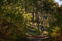 Wandelaar door de bossen met een mooie ochtendzon van Percy's fotografie