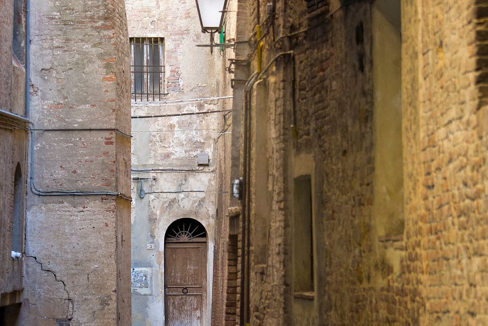 Man loopt aan het eind van een typische straat in het middeleeuwse stadje Siena in Toscane, Italië. Het beeld is gemaakt in de vroege ochtend waardoor er een prachtig licht zich langs de middeleeuwse huizen vleit.