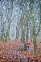 Wandelaar in het bos met bomen in de mist in het Speulderbos in Emelo Nederland.