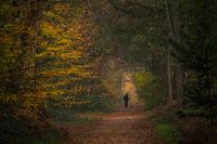 Wandelaar met hondje in het herfstbos van Moetwil en van Dijk - Fotografie
