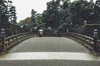 Wandelaar met paraplu die over een brug aan het wandelen is tijdens een felle bui bij een park in Tokyo, Japan.
