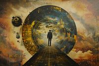 Deze betoverende kunstwerk neemt de kijker mee op een visuele reis door tijd en ruimte. Een eenzame figuur loopt door een gigantische cirkelvormige poort die lijkt te leiden naar het onbekende. De poort, rijk gedetailleerd met gouden en zwarte tinten, contrasteert met het levendige universum dat erachter ligt. Het ontwerp speelt met abstracte en futuristische elementen, en creëert een mysterieuze sfeer die tot de verbeelding spreekt. Deze compositie nodigt uit tot reflectie over het onbekende en de plaats van de mensheid binnen het grotere kosmische geheel.
