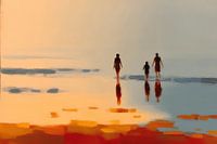 Een compositie waarin drie silhouetten over een spiegelend strand wandelen tijdens een warme zonsondergang. De intense oranje en gouden tinten versmelten met het koele blauw van de hemel, terwijl de reflecties in het ondiepe water een dromerige, bijna surrealistische sfeer creëren. Het kunstwerk balanceert tussen abstractie en realisme, waarbij de zachte overgangen en het spel van licht en schaduw een tijdloos moment vastleggen.