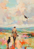 Een impressionistisch landschapschilderij toont een man die over een pad in de verte loopt. Gehuld in een lichtgekleurde jas, donkere broek, tas en stok beweegt hij zich door een verstild tafereel. Twee honden - een witte met zwarte aftekeningen en een zwarte - vergezellen hem aandachtig. Achter hen spreiden heuvels, velden en bergen in…