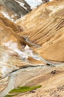 Kerlingarfjöll een bergketen in het binnenland van IJsland met prachtige beige en bruine kleuren en modderpoelen waar kokend modder omhoog komt. Er komt stoom uit de grond als of de aarde daar ook echt leeft.