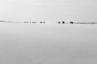 Wandelaars op het strand op een winderige dag, zwart-wit.