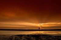 Twee wandelaars langs de vloedlijn tijdens zonsondergang op het strand van Noordwijk aan Zee.