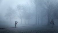 Een wandelaarster in de dichte mist in het Leeghwaterpark in Purmerend. Ze komt net uit de richting van een meer bosrijker deel van het park dat door de dichte mist grotendeels aan het oog onttrokken wordt. Het was echt dichte mist. Ik heb hier niets aan toegevoegd. Ik heb alleen de wandelaarster wat meer uitgelicht.