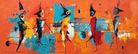 Wandelen Figuren - Dit is een abstract schilderij met figuren die in een kleurrijke, dynamische compositie wandelen, waarbij felle kleuren zoals oranje, blauw en zwart sterk opvallen en de vormen en ogen van de figuren speels en expressief zijn.