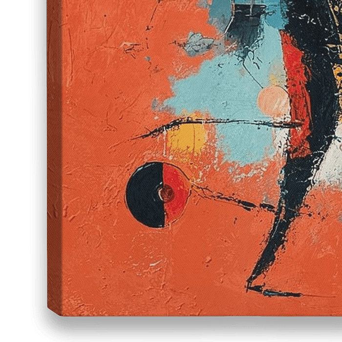 Details: abstract schilderij, kleurrijk, figuren, oranje, blauw, zwart, wandelen,…