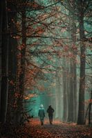 Domein Beisbroek bij Brugge , wandelaars in een bosdreef in de vroege ochtend , herfst op zijn best