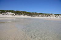 Wandelen in de lagune bij Ten Mile Lagoon in de buurt van het stadje Dalyup in Western Australia. Een van de vele stops langs Esperance's Great Ocean Drive, de rondweg van 40 kilometer met prachtige stranden, rotsachtige landtongen, kleine baaien, steile kliffen en verborgen oceaanpoelen.