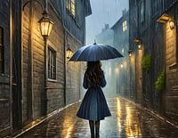 Een jonge vrouw loopt midden in de nacht alleen in de regen door een oud steegje. De lantaarns verlichten haar weg goed.