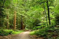 Een foto van een groen bos. Een pad slingert het bos in en het licht valt net halverwege de foto op het pad. Het is een open plek met een mooie lichtval. Het is een gemengd bos, met dennen en loofbomen. Foto is gemaakt in de Emmerdennen.