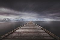 Het is een foto die is gemaakt op een houten platform dat uitkijkt naar de zee.