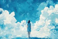 Een etherisch digitaal kunstwerk dat een vrouw in een lichtblauwe jurk toont, staand tegen een achtergrond van majestueuze cumuluswolken. De zachte, impressionistische penseelstreken en het monochrome blauwe kleurenpalet creëren een dromerige sfeer die zweeft tussen realiteit en fantasie. Het werk straalt een gevoel van vrijheid, hoop…