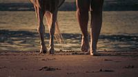Meisje en paardje wandelen gezellig samen op het strand na een leuk paardritje in de zee.