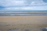 Wandelaars en meeuwen op het strand van De Panne, België onder een bewolkte lucht.