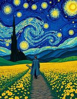 Gestileerde interpretatie van Vincent van Gogh's beroemde 'Sterrennacht' schilderij. Een eenzame figuur in een lange jas loopt over een kronkelend pad door een veld met gele bloemen, met een torenhoog, donker silhouet op de achtergrond. De lucht is levendig blauw, gevuld met wervelende, gestileerde sterren en een grote, heldere maan.