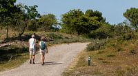 Twee wandelende mensen door een duingebied op een zonnige dag in Zeeland