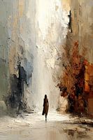 Een indrukwekkend hedendaags kunstwerk dat een solitaire figuur toont, wandelend in een atmosferische ruimte waar warme aardetinten en koele grijstonen elkaar ontmoeten. De expressieve penseelstreken creëren een dynamisch contrast tussen licht en donker, waarbij de figuur als klein silhouet fungeert tegen een overweldigende achtergrond…