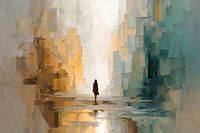 Een mysterieus abstract stadsgezicht waarin een solitaire silhouet centraal staat tegen een achtergrond van geometrische vormen in warme goudtinten en koele turquoise. De reflectie in het natte wegdek creëert een spiegeleffect dat de dramatische compositie versterkt, terwijl de impressionistische penseelstreken een dromerige sfeer oproepen.