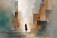 Een mysterieus silhouet staat centraal in een abstract stedelijk landschap, waar turquoise en warmbruine tinten elkaar ontmoeten in een geometrisch spel van texturen. De architectonische elementen zijn opgebouwd uit grove penseelstreken en rechthoekige vlakken, die een dromerige atmosfeer creëren waarin realiteit en abstractie versmelten.