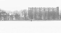 Man loopt door Transwijkpark in Utrecht die bedekt is met een grote laag sneeuw.