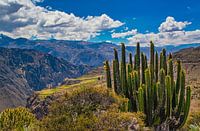 Wandeling langs de Colca Canyon, Peru. De plek om condors te spotten. Hier groeien grote cactussen. Colca Canyon is de kloof van de Colca in het zuiden van Peru. Hij ligt ongeveer 160 kilometer van Arequipa en is meer dan twee keer zo diep als de Grand Canyon in Amerika. Maar de wanden zijn niet zo recht als die van de Grand Canyon. Door de bijzondere vormen van het landschap (terrassen) en de twee grote kloven is deze plek gemakkelijk te vinden op satellietfoto's. De Colcavallei is een kleurrijk gebied dat door de Spanjaarden ontdekt is. De lokale bevolking houdt zich nog altijd aan de oude tradities en leefwijze en maakt dus nog altijd gebruik van de landbouwterrassen.