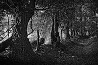 Dichtbegroeid wandelpad met knoestige bomen langs de weilanden in de Belgische voerstreek bij Teuven.