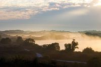 Duingebied Berkheide tussen Katwijk en Wassenaar. Ochtend met mist bij opkomende zon. Hollandse Duinen van nationaal park Hollands Duin. Sfeervol landschap gefotografeerd in de vroege ochtend.