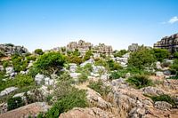 In deze foto zie je een schilderachtig wandelpad dat door het unieke landschap van El Torcal slingert tijdens de golden hour. Het zachte licht accentueert de bijzondere rotsformaties aan weerszijden van het pad en creëert een uitnodigende sfeer voor wandelaars en natuurliefhebbers. Terwijl je langs deze natuurlijke sculpturen wandelt, voel je jezelf verbonden met de geschiedenis van dit gebied; elke steen vertelt een verhaal over miljoenen jaren geologische veranderingen. De flora rondom het pad voegt kleur toe aan het landschap en maakt deze wandeling nog aangenamer. Dit beeld nodigt uit tot avontuur en ontdekking in een omgeving die zowel serene als inspirerende momenten biedt.