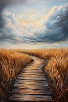 Een zacht gebogen houten wandelpad loopt door een gouden zee van glinsterend gras, terwijl de lucht erboven blijft hangen in dramatische grijstinten en delicate lichtstralen. Dit landschap nodigt je uit om de stilte van de natuur te verkennen en je gedachten de vrije loop te laten, alsof elke wolk een verhaal te vertellen heeft.