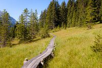 Een houten wandelpad door een ven in de bergen van de Alpen boven St Anton am Arlberg (Oostenrijk).