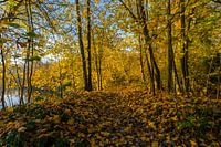 Een wandelpad op landgoed de Horsten in herfstkleuren in optima forma. Langs een meertje tijdens opkomende zon!