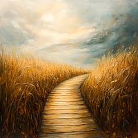 Een zacht houten pad baant zich een weg door de gouden zee van hoge grassen, terwijl dramatische wolken hun schaduwen werpen in de lucht. Het warme licht creëert een vredige sfeer en nodigt je uit om dit mysterieuze pad verder te verkennen, richting de onzekere horizon. Een plek vol mogelijkheden en dromen wacht op de wandelaar.