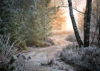 Op een koude februari ochtend liep ik langs dit wandelpad. De zon begon met greep te krijgen op de mist en de eerste kleuren waren goed te zien aan het einde van dit pad.