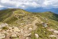 Op dit beeld zie je het wandelpad, dat eindeloos doorloopt naar de achtergrond. Met rotsen op de voorgrond en de groene weilanden aan beide zijden van de bergkam.