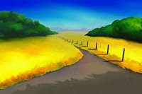 Digitaal schilderij van een landschap met velden, bomen en bergen in de verte. Een voetpad loopt tussen de velden naar de uitlopers van een bos en verder weg. Een helderblauwe lucht versterkt het gevoel van zomer en zon.