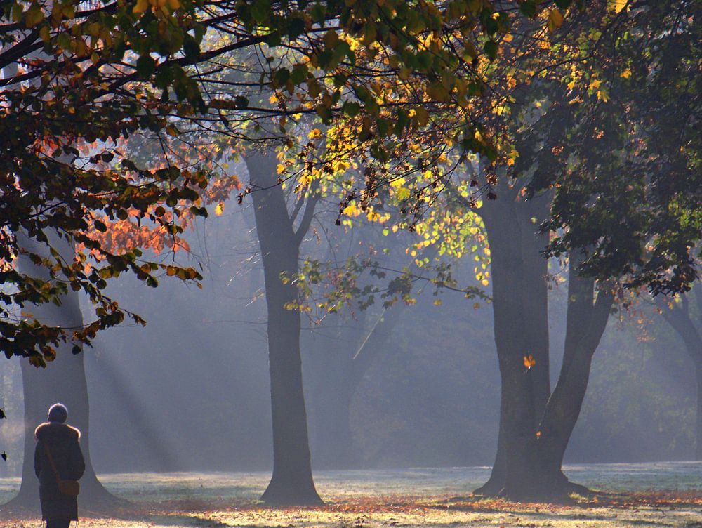 Zonsopgang en mist in de herfst in Gelsenkirchen in de Berger Aue