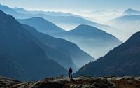 Een man kijkt uit over vele lagen mistige bergen nabij Chamonix, Frankrijk. Deed me denken aan Wanderer above the Sea of Fog van Caspar David Friedrich:)