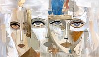 Abstracte collage met vrouwengezichten, verf,papier en lijntekening elementen in naturel aardetinten met blauw en goud accenten.